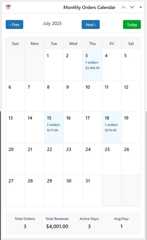 This advanced widget creates a full monthly calendar view showing daily order counts and revenue with navigation arrows to browse different months. Perfect for getting a visual overview of your…